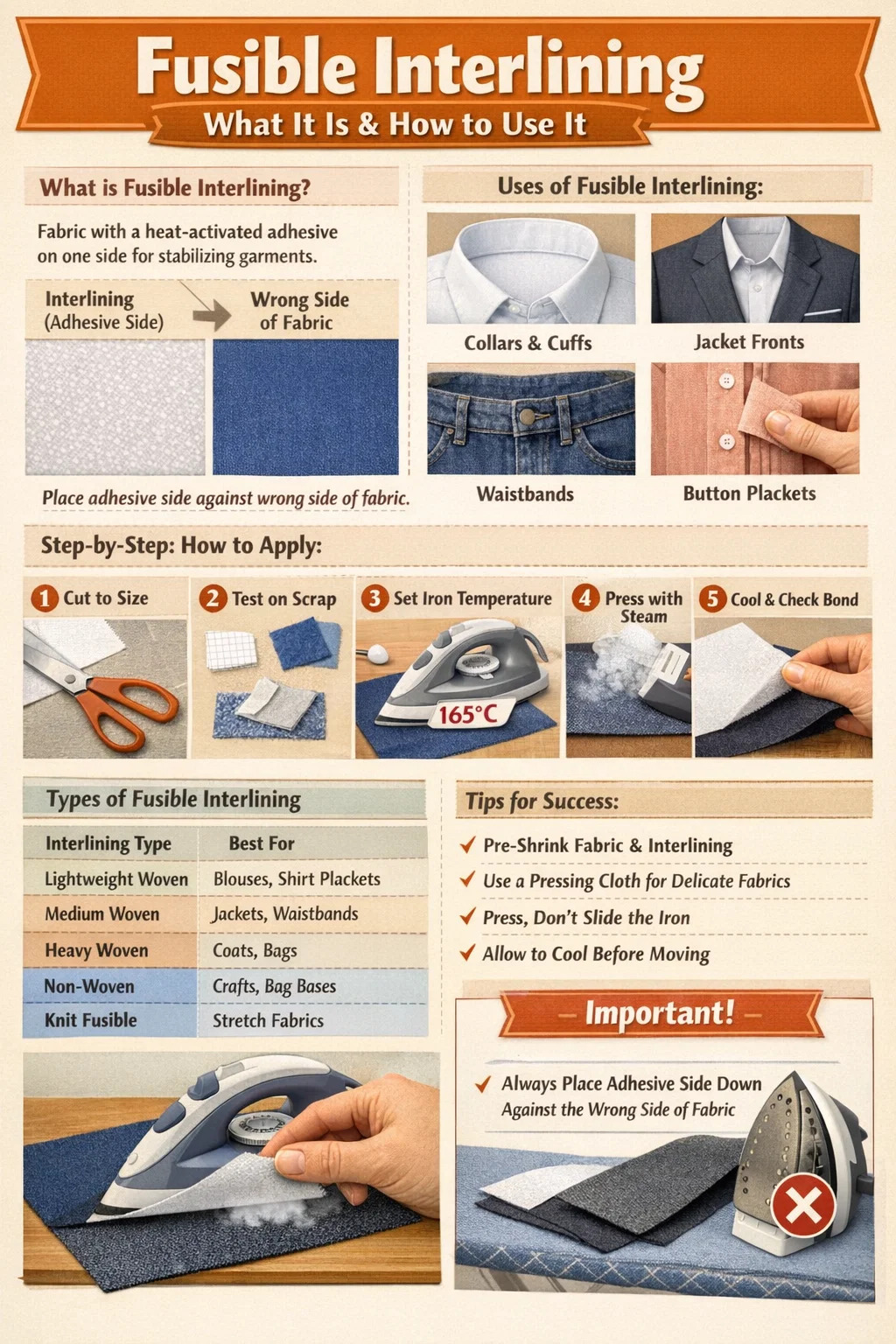 처음부터 가용성 심지를 올바르게 적용하면 직물과 좌절감을 모두 줄일 수 있습니다. 결합 실패(거품이 생기거나 벗겨지거나 심지가 부분적으로 분리되는 현상)는 일반적으로 잘못된 온도, 불충분한 압력 또는 다리미를 누르는 대신 움직이는 경우에 발생합니다. 매번 이 순서를 따르세요.