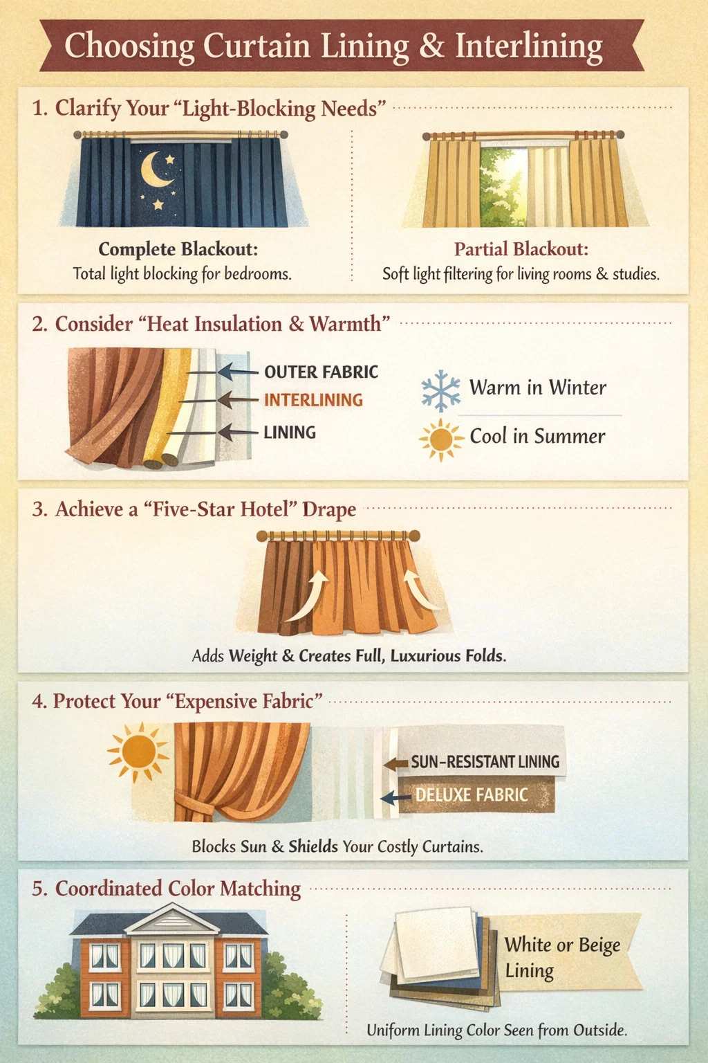 커튼 안감 선택 및 심지 이는 커튼에 "속옷"과 "겉옷"을 입는 것과 같습니다. 외부 패브릭은 커튼의 외관을 결정하는 반면, 이 두 내부 레이어는 얼마나 기능적이고 잘 드레이핑되는지를 결정합니다.
