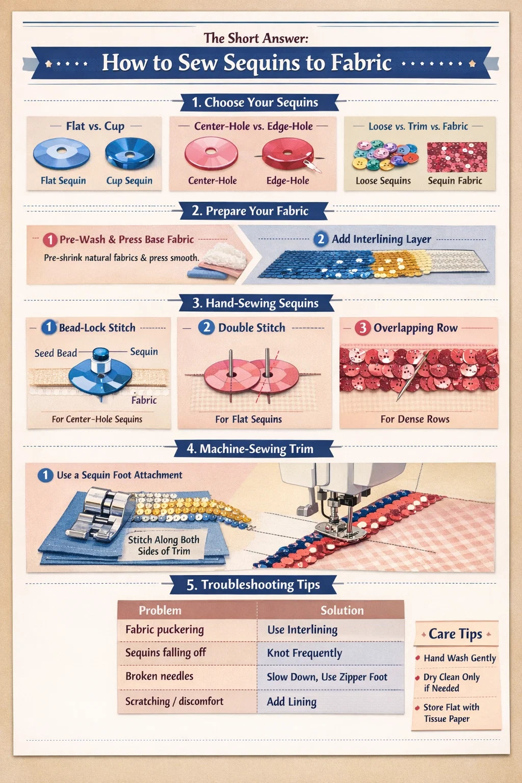 이 가이드는 올바른 스팽글 선택, 원단 및 심지 준비, 개별 조각 손바느질, 기계별 스팽글 트림 적용, 일반적인 문제 해결, 완성된 프로젝트 관리 등 모든 단계를 안내합니다. 특정 스티치 수, 실 유형 및 심지 무게가 포함되어 있어 집에서 만든 것보다 전문적인 결과를 얻을 수 있습니다.