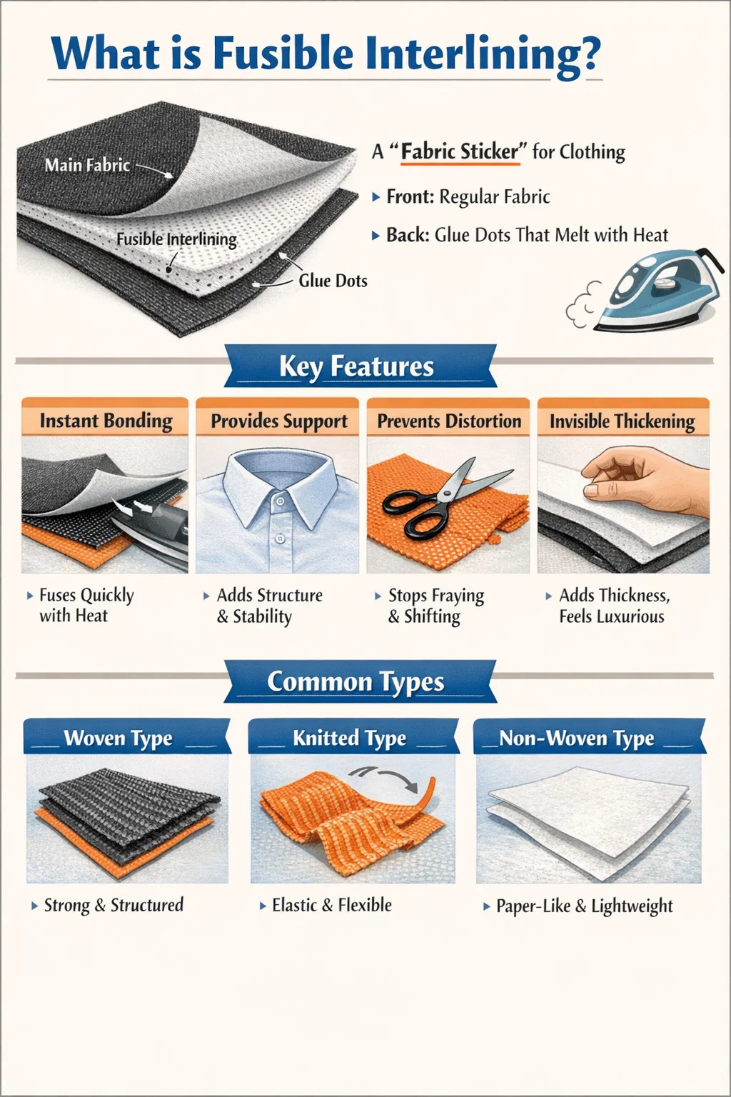 **"패브릭 스티커"**라고 생각하시면 됩니다. 앞면은 일반 직조 또는 부직포이고 뒷면은 작은 접착제 입자로 덮여 있습니다. 이 접착제는 실온에서는 건조하고 끈적이지 않지만 가열하면 녹습니다.