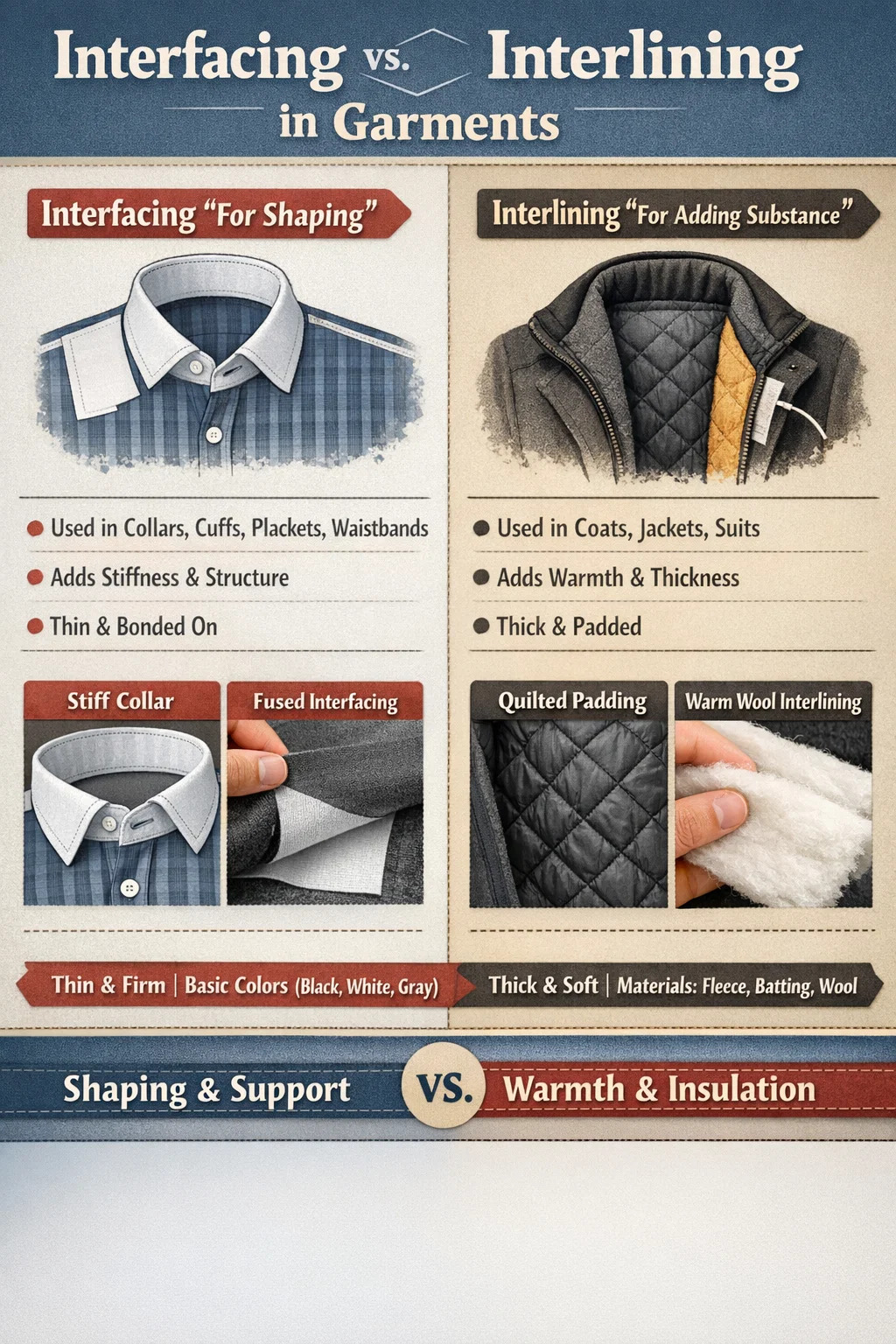 인터페이싱은 의류의 지지 구조 역할을 하며, 주로 의류의 특정 부분을 더 단단하고 구조적으로 만드는 데 사용됩니다.