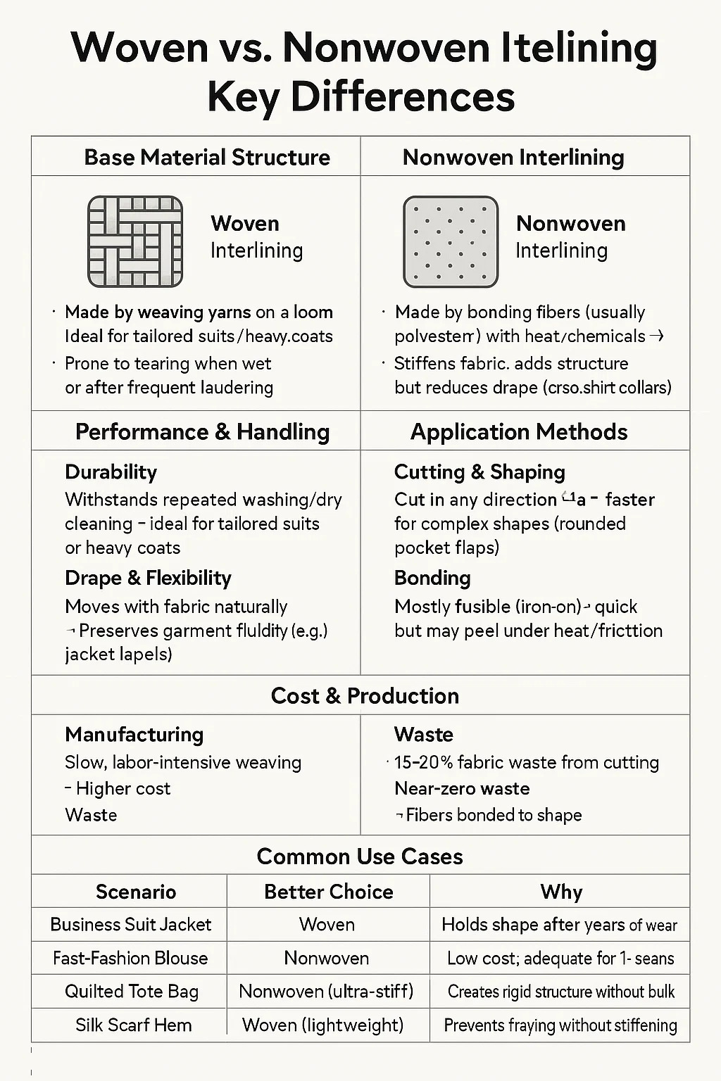 짠 interlining : 직기에 원사 (면, 폴리 에스테르 또는 블렌드)를 직조하여 제작 → → 뚜렷한 곡물 라인 (Warp/Weft)이 있습니다.