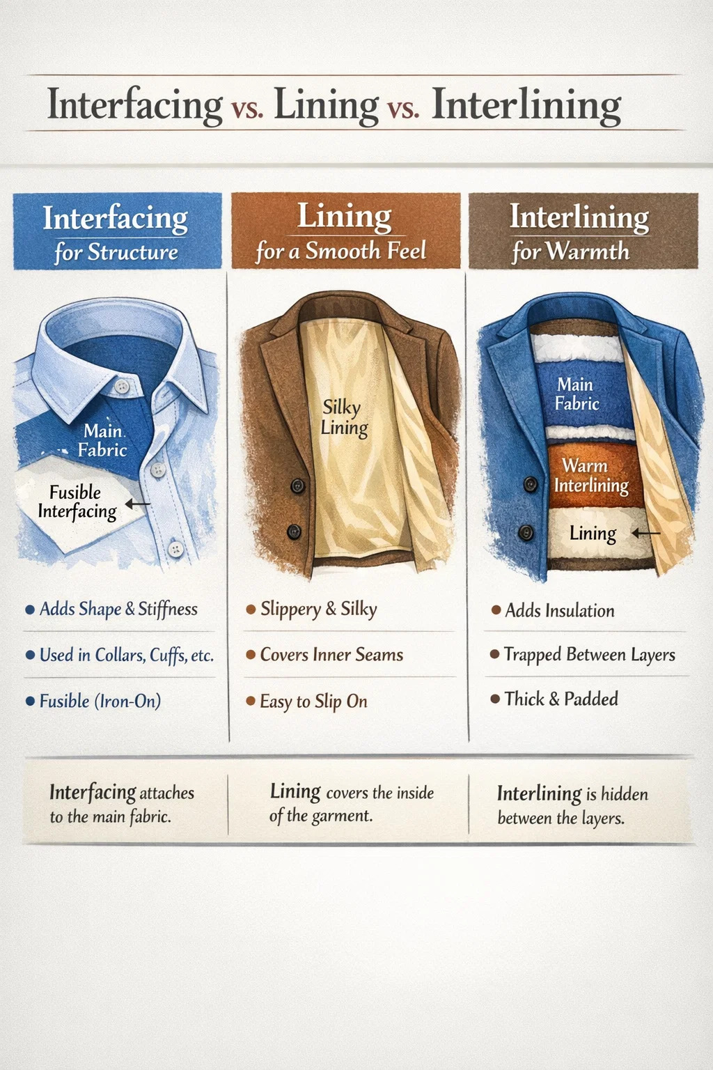 의류제작, 인터페이싱, 안감, 심지 뒤에서 일하는 세 명의 이름없는 영웅과 같습니다. 각각은 늘어진 원단을 구조적이고 따뜻하며 편안하게 완성된 의류로 변화시키는 데 있어 뚜렷한 역할을 합니다.